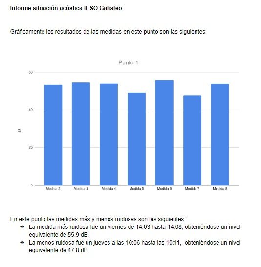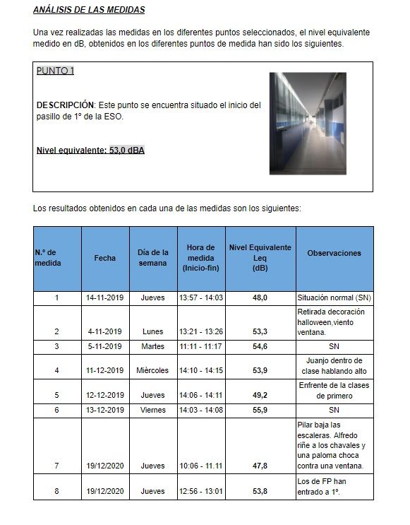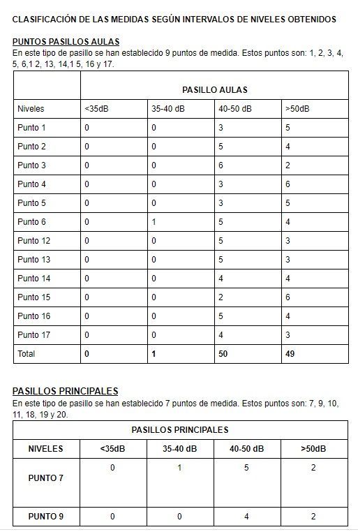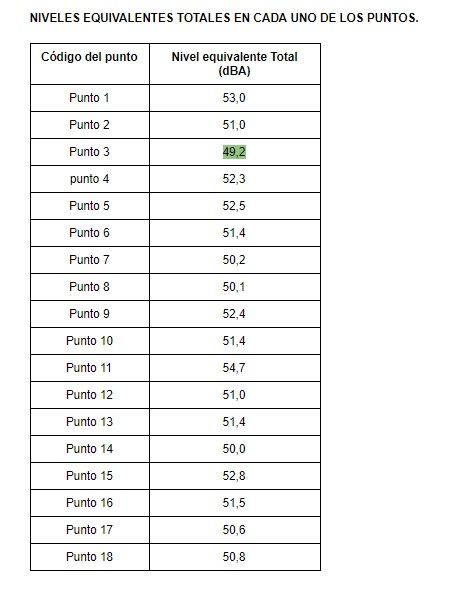 En el informe se establece también un resumen de los niveles equivalentes totales calculados para cada uno de los puntos, estableciendo el punto más y menos ruidoso del instituto.